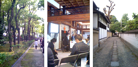 写真左は聖福寺の正面参道。写真中央建屋内(講演会ショット)。写真右は測道。